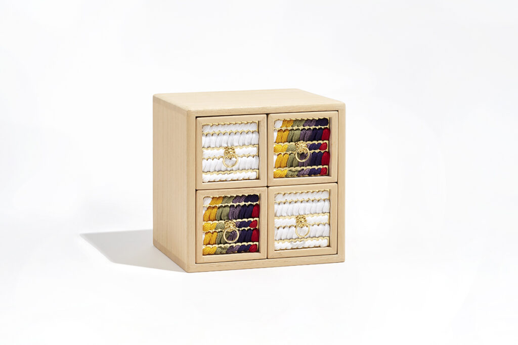 平安・鎌倉時代の甲冑に見られる装飾「威(おどし)」を、武士の美意識として現代デザインに昇華し表現、ツマミには甲冑に用いられる金具「菊座」を採用しました。工芸品としての佇まい、インテリアとしての美しさ、普段使いの実用性を職人の高度な技術で実現。引き出し正面の鮮やかな組紐の配色には縁起を担ぐ願いが込められ、「調和・家庭円満」などを象徴させています。