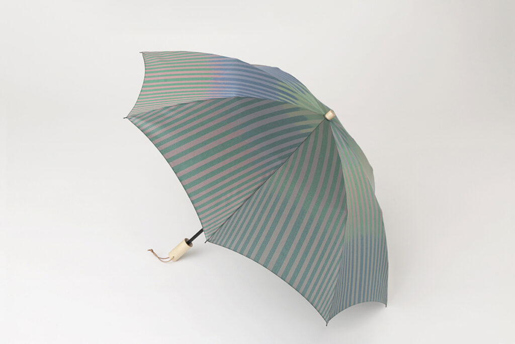 メンズ傘「R A M U D A 」を手がける市原の新しい試み。朝から夜の空の色の移り変わりを表現するために特殊な織り方で製作したオリジナル生地は、光の加減で多様に色が変化する、まさに虹色の傘。「生地に合わせて傘を作る」素材に寄り添う製法を一貫して守り続けるその姿勢は、使う人の日常まで考えたデザインや、折り畳まなくても傘を仕舞うことのできる傘袋にも表れています。
